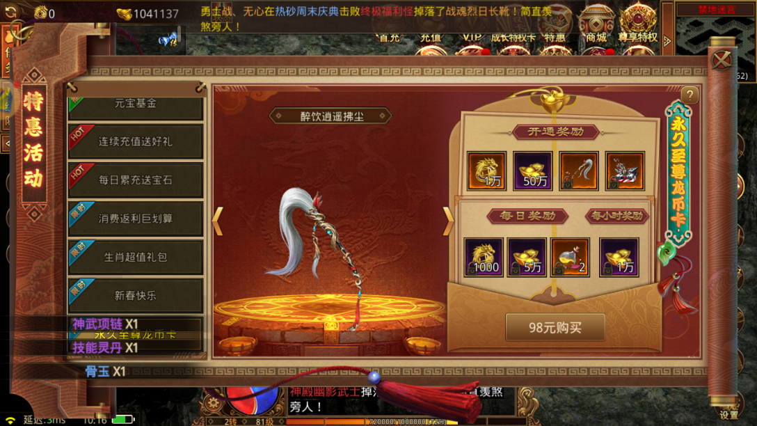 - 在行会除魔活动中,玩家可以获得经脉散、强化石和大量元宝等奖励,用于提升元神经脉和强化装备。